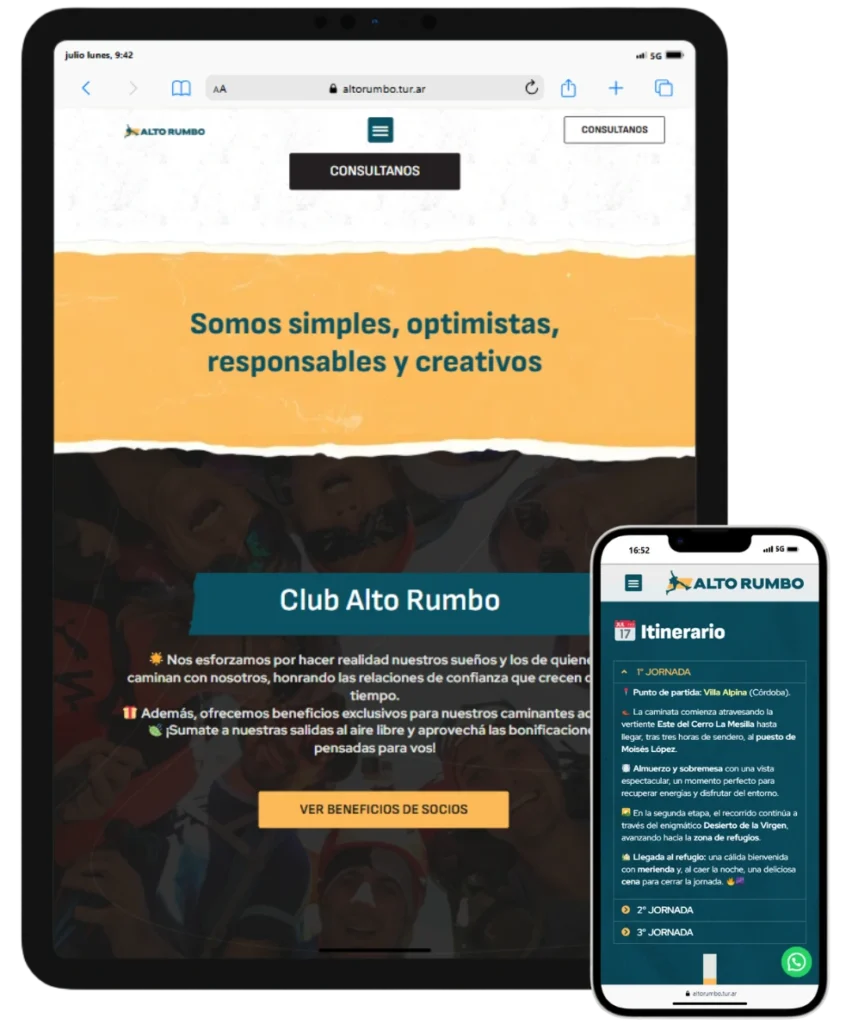 Desarrollamos un sitio web integral, enfocado en presentar de manera clara y atractiva cada una de las propuestas de Alto Rumbo. La web destaca las distintas categorías de salidas (travesías, expediciones, cumbres), junto con la información clave sobre cada experiencia: dificultad, fechas disponibles y cómo reservar.