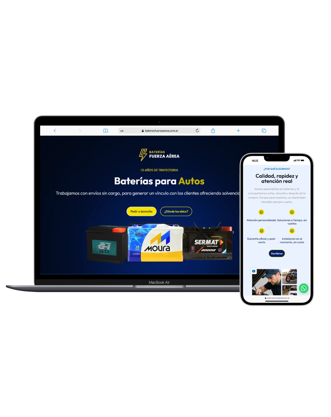 Baterías Fuerza Aérea es una empresa con más de 10 años de experiencia en la venta y colocación de baterías para autos, motos y utilitarios. Se destacan por su atención personalizada, soluciones a medida y un servicio rápido y garantizado.